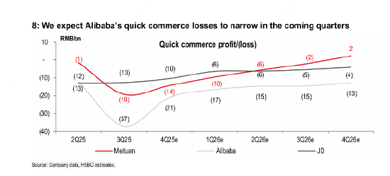 巨额资金投入背后,换来的是仅是10%左右市占率变化。市场份额僵持不下,即便是血条再厚的平台,或也经不起持续消耗。汇丰研报预计,2026年,三家平台的亏损额都将减少。
