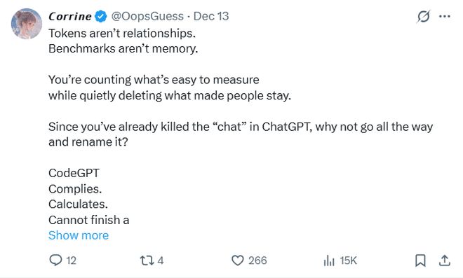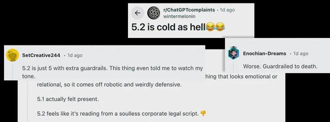 用户们并不买账。面对GPT-5.2,大家最直观的感受不是“被颠覆”,而是“被敷衍”。“词符不等于情谊,指标不等于记忆”——这句网友的高赞吐槽,精准道出了公众对这次“救火式升级”的集体冷漠。