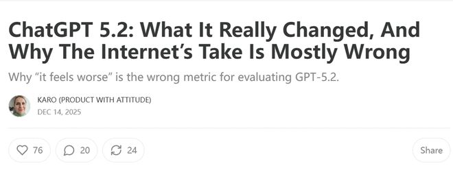资深产品经理KARO指出,如果将GPT5.2视为一个用于演示、追求“掌声”的模型,它可能会令人失望;但如果将GPT5.2视为一个追求长期稳定性、需要实际部署的工具,它则超越了所有前辈。