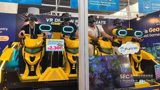 (卓远展位上,外国客商正在体验新款VR游乐设备。本报记者郑玮/摄)