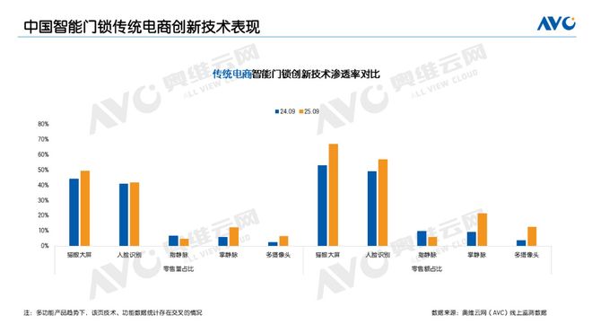 技术层面,传统电商智能门锁产品创新加速。具备猫眼大屏、掌静脉识别、多摄像头等功能的产品市场份额显著提升,推动智能门锁的价值升级。