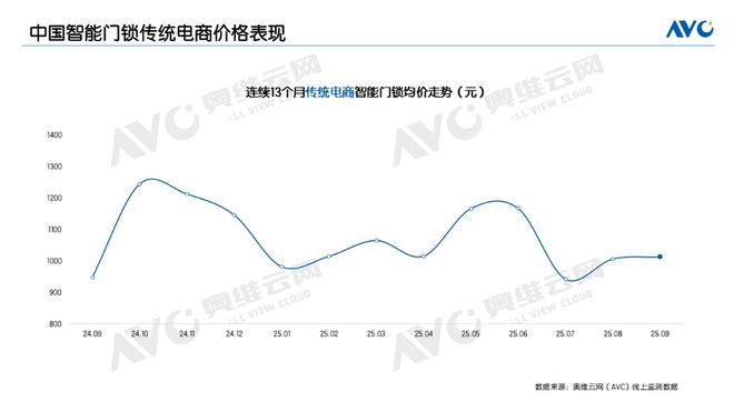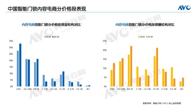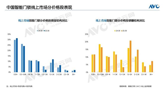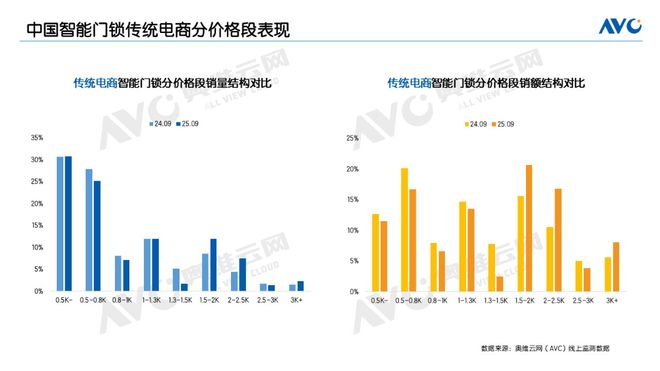 9月,传统电商平台的量额规模均实现两位数同比增长,成为支撑线上整体市场增长的核心动力。价格方面,9月传统电商均价保持在千元以上,1500-2000元产品的量额增幅均超50%,2000-2500元产品的量额增幅超过80%,3000元及以上高端产品的量额增幅均超过70%,充分体现出消费者对高品质智能锁的强劲需求。