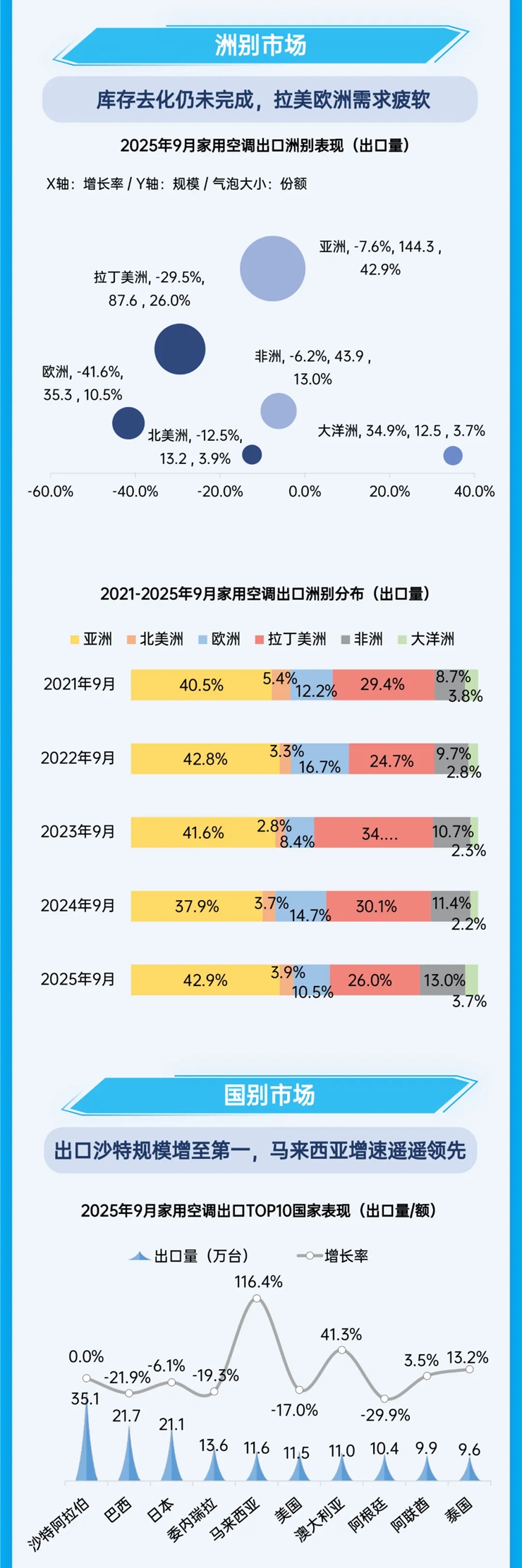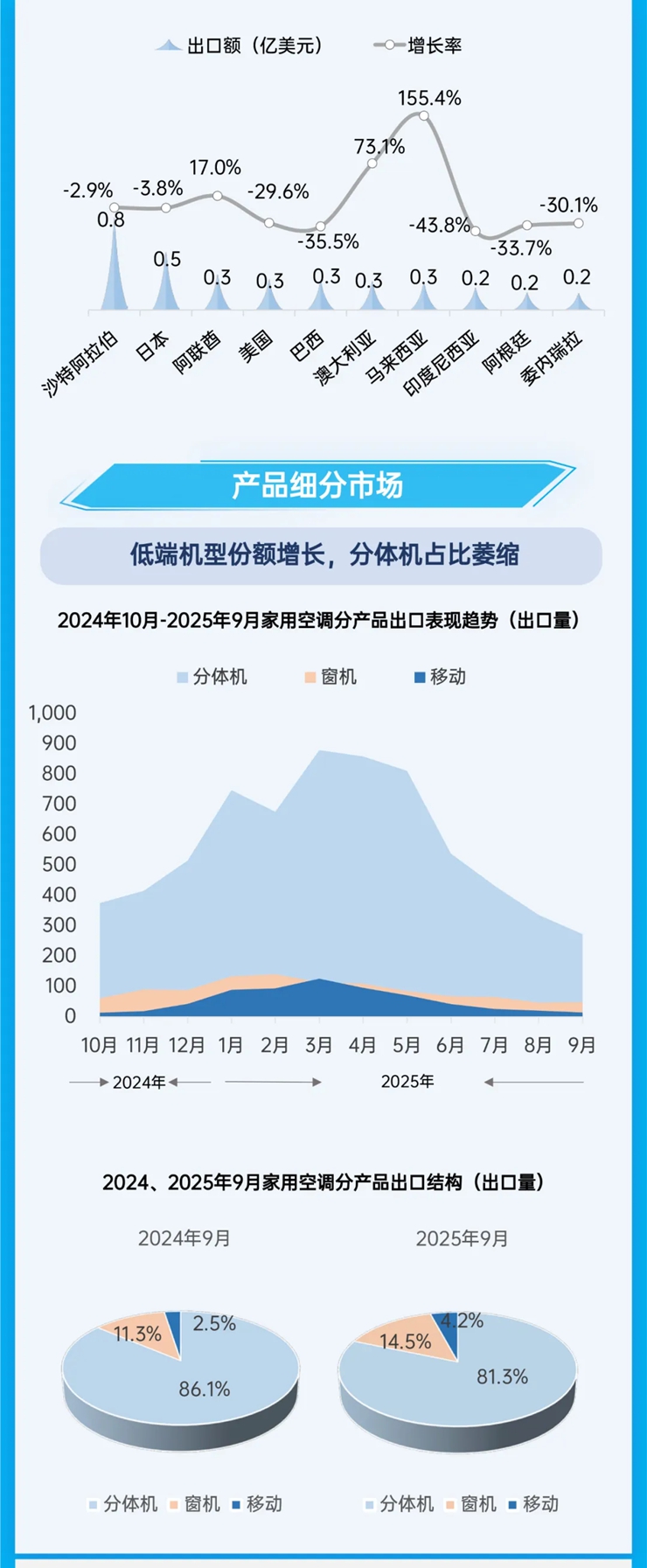 当前出口持续走低可归因于多方面影响:一是主要市场库存去化仍未完成,特别是拉丁美洲及部分欧洲国家,渠道商提货意愿持续疲软:二是区域性政策与外汇因素仍在制约订单释放,如北美关税压力、印尼等市场的美元流动性收紧;三是全球多数地区高温季节渐尽,终端需求进入淡季调整。