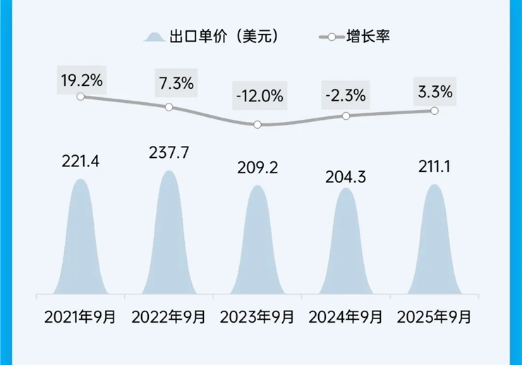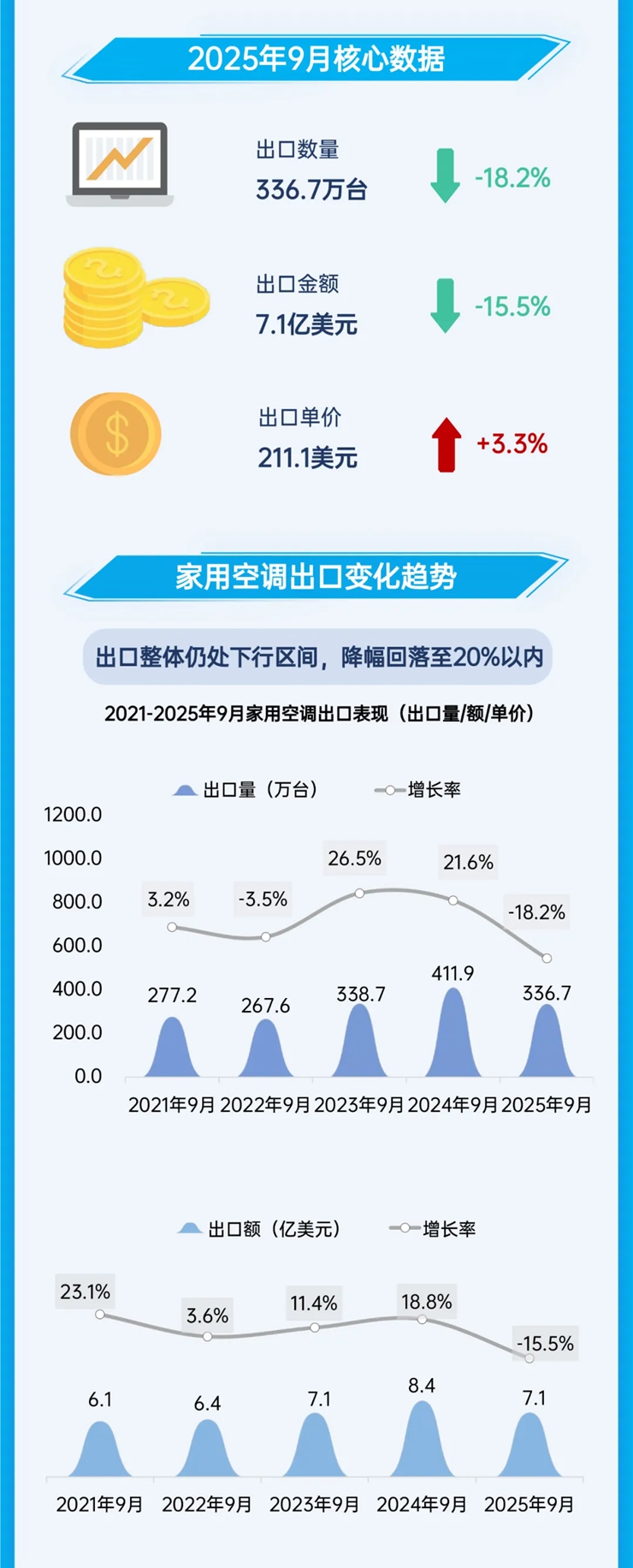 产业在线数据显示,2025年9月,中国家用空调出口量336.7万台,同比下滑18.2%:出口额7.1亿美元,同比下降15.5%:平均出口单价211.1美元,同比增长3.3%。尽管出口整体仍处于下行通道,但本月降幅较前期有所收窄,为近四个月来首次回落至20%以内,反映出行业在持续探底过程中出现边际缓和迹象。