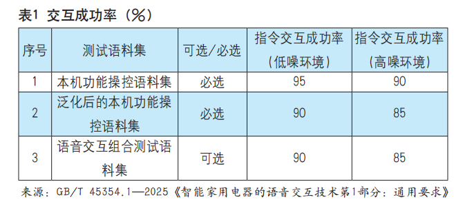 为此,2025年2月28日,GB/T 45354.1—2025《智能家用电器的语音交互技术第1部分:通用要求》(以下简称《通用要求》)发布。《通用要求》规定了智能家电的语音交互分类、语音交互框架结构、语音交互技术要求以及标志、指示和使用说明,适用于通过语音方式进行交互的智能家电的设计、开发、测试和评价。
