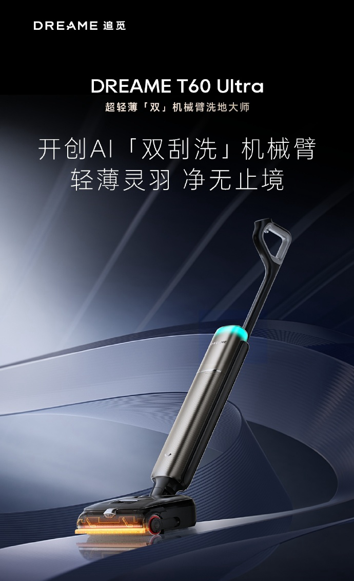 将具身智能引入洗地机首创推出的AI「双刮洗」机械臂,让洗地机可以像人一样“思考”,再通过多维度传感器去“感知”地面,首次在洗地机产品上实现“协同清洁”行为;搭载着追觅首创灵羽超轻薄系统的T60Ultra洗地机,以行业内最薄机身轻松穿梭于沙发底、床底、柜底等低矮空间;H60Ultra的“蒸汽+热水”双热洗地系统,可实现99.9999%的除菌除病毒与100%的厨房油污去除效果。