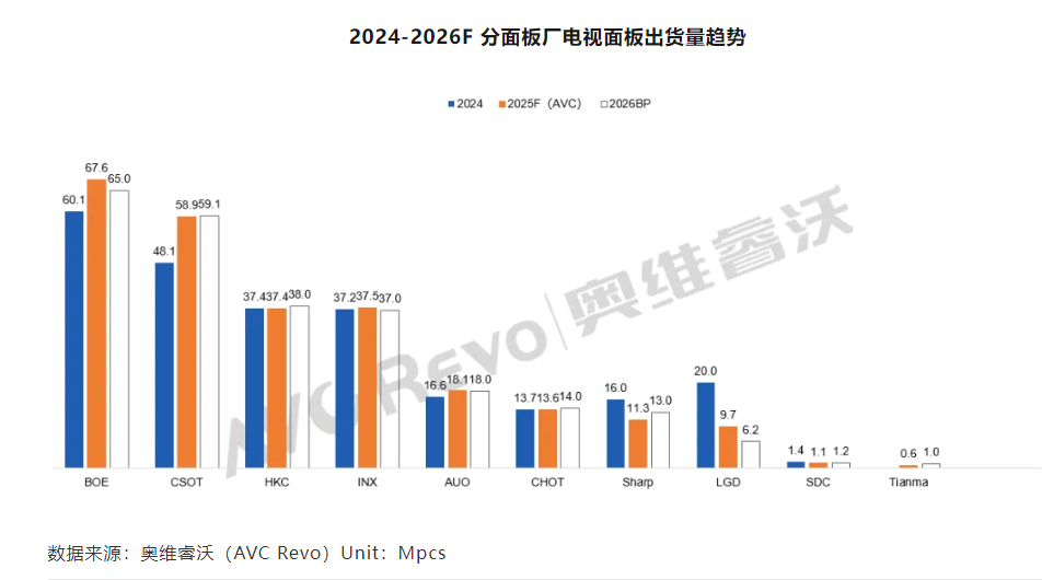 从品牌来看,根据奥维睿沃数据,2025年电视面板出货量排名将呈现稳定态势,京东方、TCL华星、惠科三大中国品牌将继续保持领先地位。具体来看: