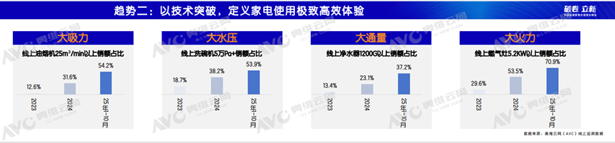 一批以“大吸力、大水压、大通量、大火力”为代表的“大规格”产品,正成为推动高端化进程的重要引擎。奥维云网数据显示,线上市场中,2025年1-10月大吸力油烟机(25m³/min以上)销售额占比达54.2%,大水压(50000pa+)洗碗机销售额占比53.9%,大通量净水器(12000L以上)销售额占比37.2%,大火力燃气灶(5.2kW以上)销售额占比更是高达70.9%,较2024年相比都有两位数的提升。这些数字背后,不仅是产品参数的提升,更是消费者对“功能价值”的重新定义与追求。