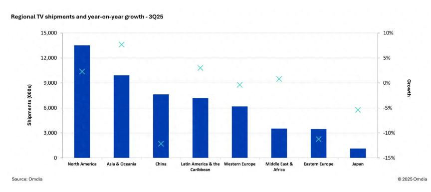 今年第三季度全球电视市场呈现“东方不亮西方亮”的市场特性。据行业知名机构Omdia数据显示,三季度全球电视出货量达5250万台,同比小幅下滑0.6%。尽管跌幅微弱,但区域表现呈现剧烈分化:中国市场同比大幅下降12.2%,成为拖累全球增长的主因;北美市场小幅增长2.3%;亚洲及大洋洲市场则表现亮眼,增幅达7.7%。这种“中国市场疲软、其他区域相对稳健”的格局,折射出全球彩电市场在政策周期、需求结构及品牌战略层面等多层原因叠加下出现不同分化。