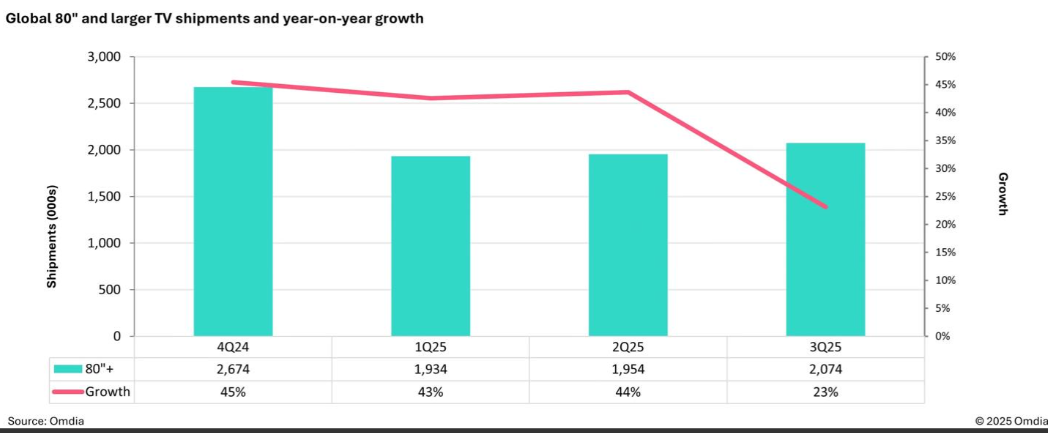 中国市场的显著下滑,直接源于2024年“以旧换新”政策刺激后的需求空窗期。政策推动的集中换机潮提前释放了消费潜力,导致2025年新增需求乏力。更值得关注的是,此前高速增长的大尺寸电视市场明显失速:80英寸及以上产品增速从去年同期的超40%骤降至23.1%,70-79英寸品类增速更是锐减至1.1%。这一变化不仅反映消费信心的在下降,同时也透露了大屏电视作为非刚性消费品的市场脆弱性。