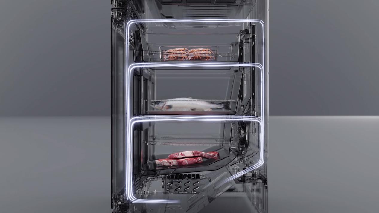 正是因为看到这些变化,所以当别的品牌还在温度、湿度这些传统指标上努力时,卡萨帝已经升级到了“细胞级保鲜”的层面。这次冻荔枝用的,就是卡萨帝一项原创科技——底置循环风幕。她能快速把温度降到-30℃,瞬间锁住食材细胞里的水分;同时让冷气平行环绕流动,温度波动极小,风速近乎为零,这样冷风不直吹,实现恒温锁鲜。如此一来,像高端牛排、深海鱼这些食材,冷冻60天也能尽量保持原汁原味。