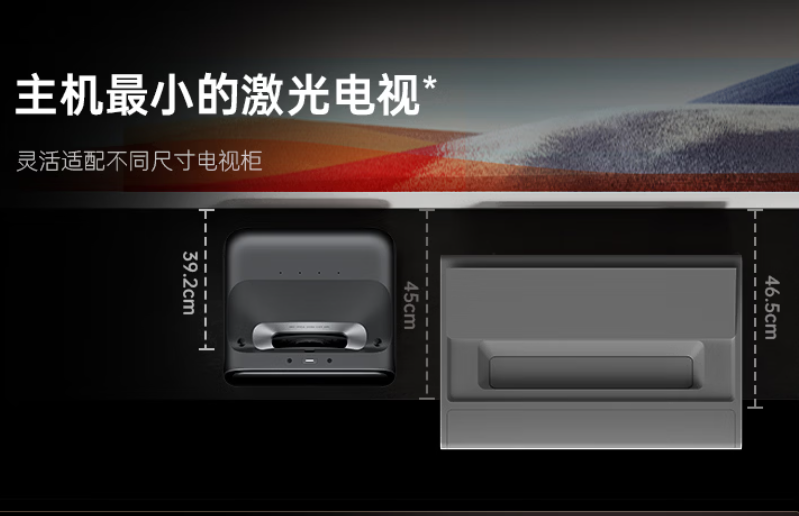 其一,号称业界主机体积最小的激光电视。从体积上看,其主机尺寸仅为312mm(长)x290mm(宽)x140mm(高),重量4.4公斤。这个数据意味着什么?它比许多传统音箱还要小巧,彻底颠覆了激光电视主机“相对笨重”的固有印象。