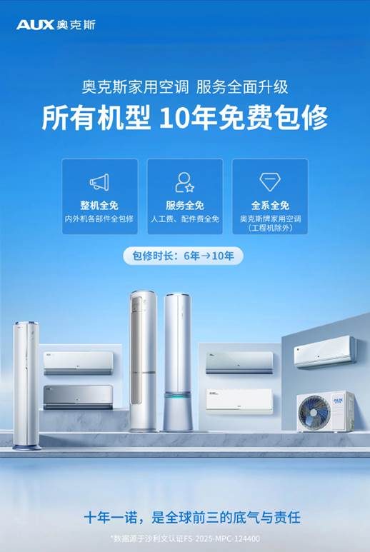 奥克斯空调以“用户至上”为核心,完成了服务承诺的阶梯式升级。2025年9月,品牌率先对指定机型推出“10年整机免费包修”政策,随后于12月加码升级,宣布自2026年1月1日起,在全国范围内将该服务覆盖至家用全系列空调产品。