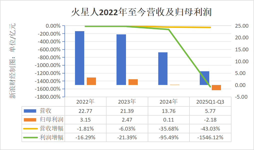 据《BUG》栏目统计,自2021年以来,火星人营收及净利润已连续4年下滑。2022年至2024年及2025年前三季度,火星人历年营收分别为22.77亿元、21.39亿元、13.76亿元、5.77亿元,同比下滑1.81%、6.03%、35.68%、43.03%,营收逐年下滑,且下滑幅度不断扩大。