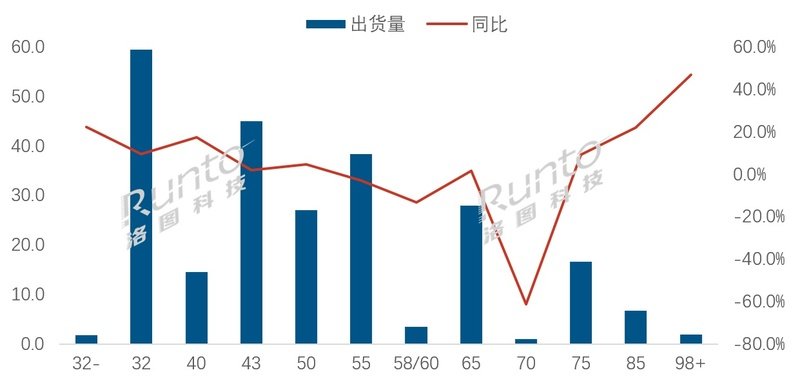 根据洛图科技(RUNTO)数据显示,2025年,全年出货量第一的面板尺寸仍为32英寸,出货量约5960万片,同比增长9.8%;市场占比为24.3%,较2024年提升1.4个百分点。