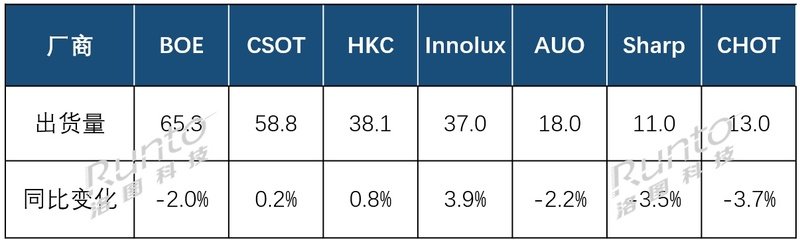 尾部三家厂商CHOT(彩虹光电)、Sharp(夏普)和LGD(乐金显示)的出货量有不同程度的下降。