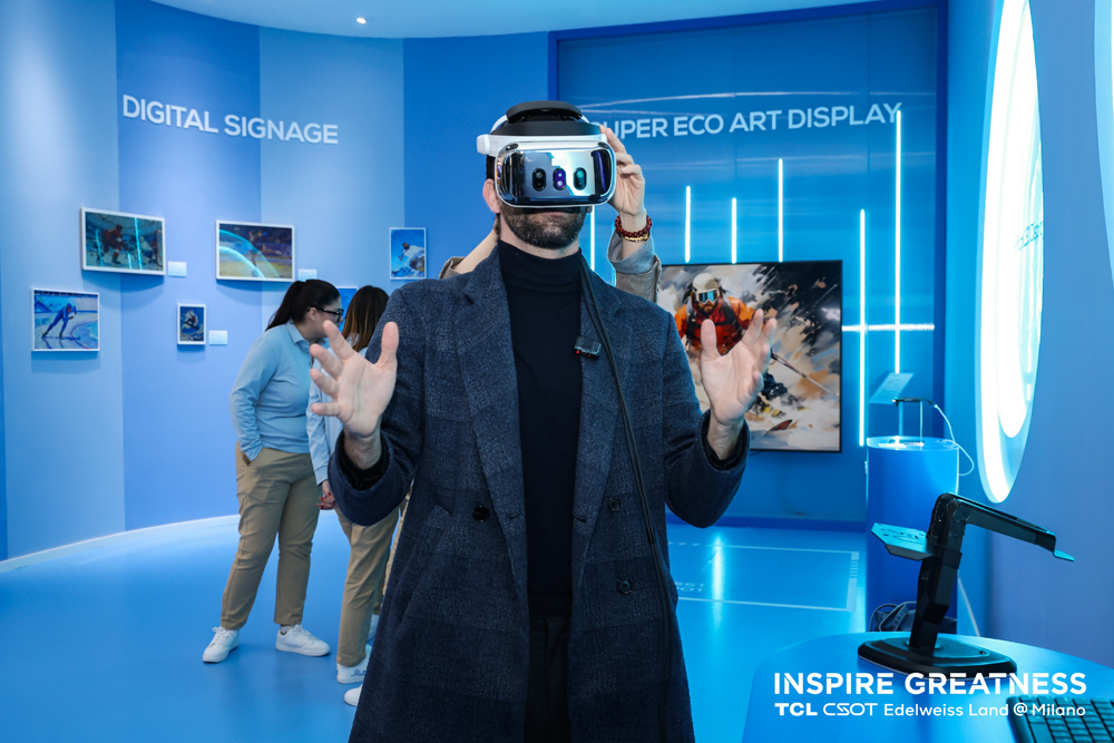 在“雪绒奇境(TCL Edelweiss Land)”冬奥主题展现场,VR显示(3.59")- Varjo、MR显示(2.56")- PICO 4 Ultra、全球最小硅基Micro LED显示(0.05")等产品备受瞩目。结合TCL华星为XR类产品深度打造的轻量化、低功耗的高清显示解决方案,充分体现了TCL华星以Display for AI打造契合AI时代需求的"一块好屏"。例如Varjo VR搭载了TCL华星全球首款3.59英寸1512PPI量产产品,采用双目8K显示屏,单眼分辨率3840×3744,搭配120° FOV的超宽视场角,带来更逼真的光影效果、细致入微的细节呈现。PICO 4 Ultra搭载了TCL华星的2.56英寸1200PPI MR产品,采用双目4K+超清显示屏,配合105°的超广视场角,画面丝滑,虚实融合精准无偏差。