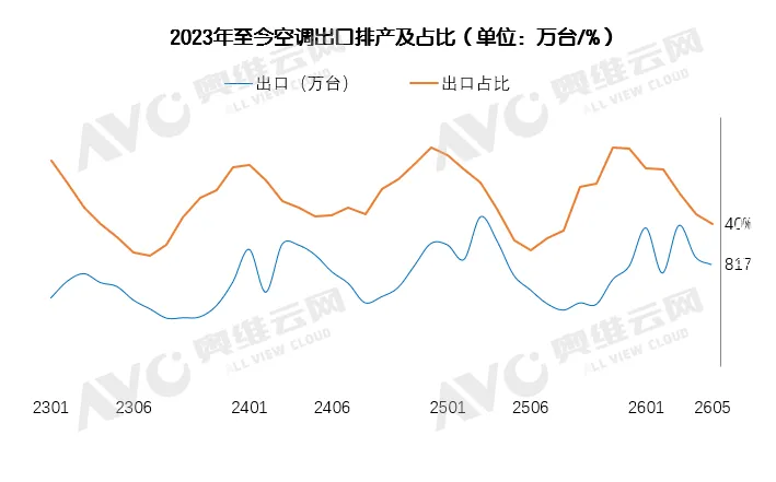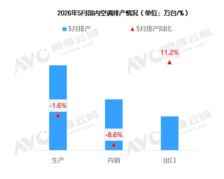 2026年5月空调排产数据出炉,行业内外销走向出现罕见的剪刀差趋势。奥维云网PSI监测数据显示,5月空调内销排产同比下滑8.6%,而出口排产同比增长11.2%。一降一升之间,折射出当前中国空调产业所面临的复杂局面:国内市场寒意逼人,海外市场则在低基数效应下呈现阶段性回暖。