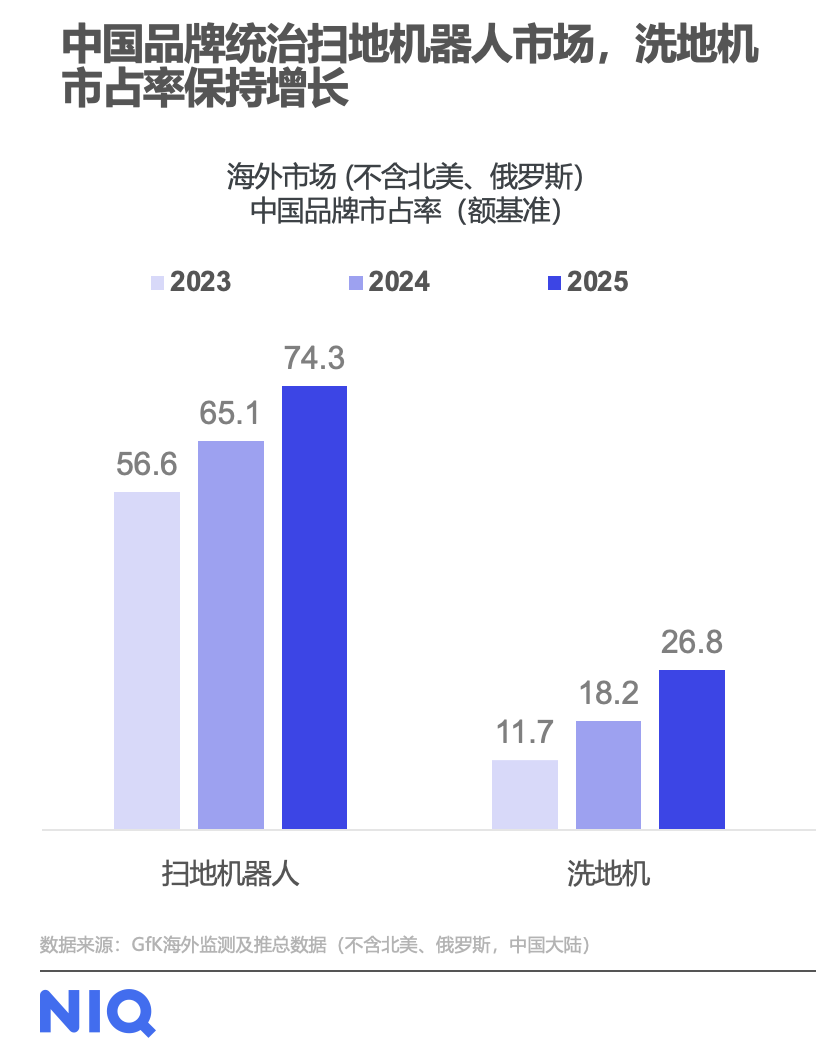 其中最牛的依旧是扫地机器人。中国品牌在扫地机器人领域已经形成了绝对主导地位。2025年,中国品牌在这个品类里的海外销售额市占率已经达到74.3%,在2023年仅占56.6%,这基本是“统治级”的表现。洗地机和推杆吸尘器也在稳步追赶:洗地机市占率从2023年的11.7%涨到2025年的26.8%,推杆吸尘器从2.5%涨到4.0%。这背后反映的是,中国品牌在系统集成、供应链效率和产品迭代速度上的综合优势。清洁电器已经成为中国品牌最具全球竞争力的小家电赛道之一。