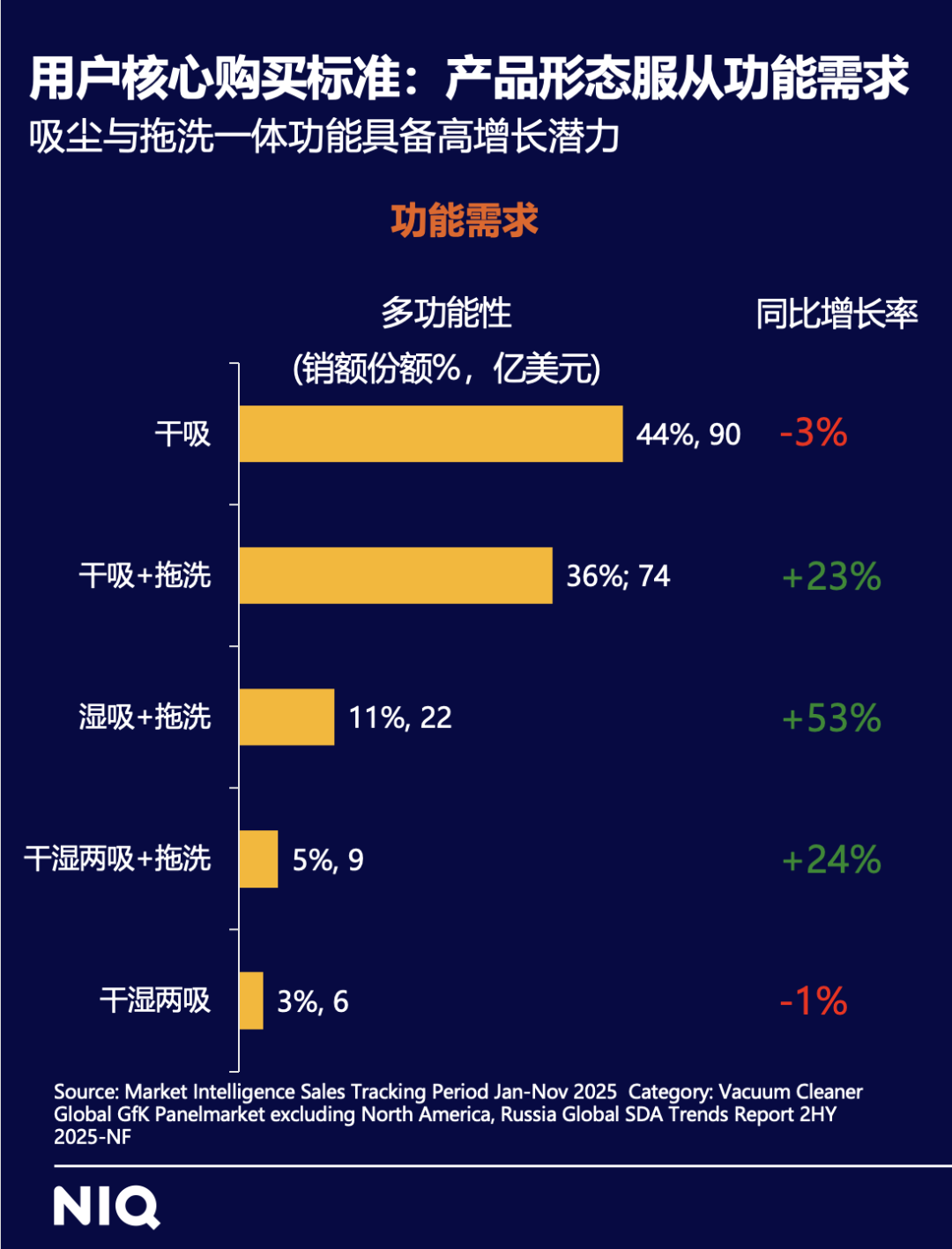 聚焦到吸尘器品类,可以看到当前这一轮增长,核心来自功能的一体化升级。无论是扫地机器人还是洗地机,“吸尘+拖洗”已经成为用户最明确的需求方向,消费者不再纠结产品形态,而是更关注是否真正解决清洁问题。