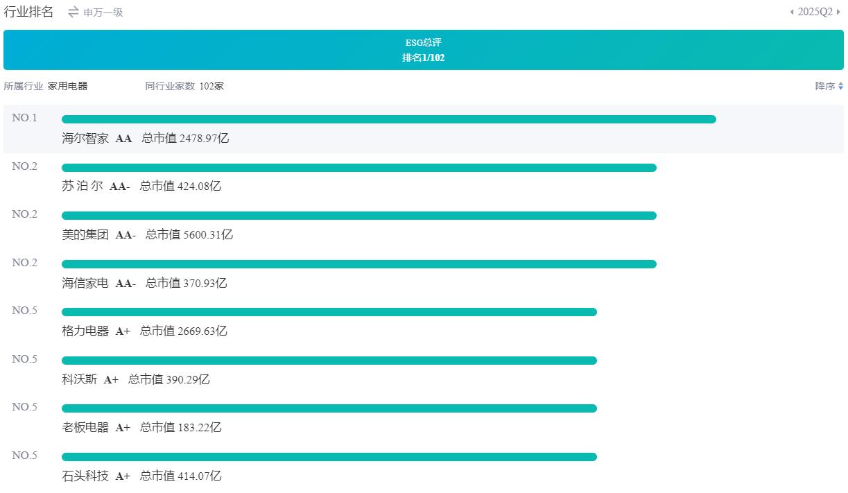 中诚信2025半年ESG评级出炉:海尔智家AA、美的AA-、格力A+