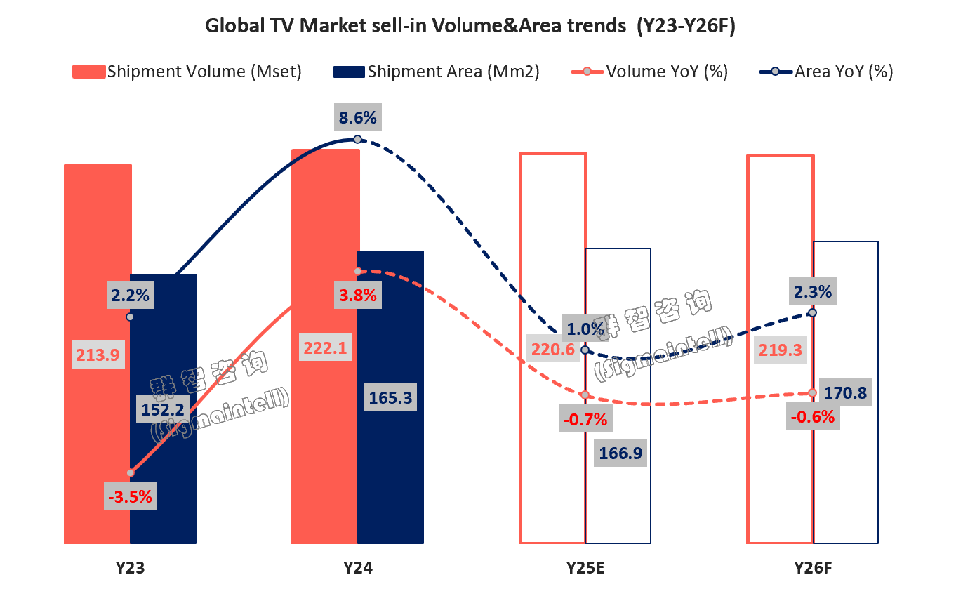 从群智的数据来看,2025~2026年全球TV出货量将持续处于微跌局面。
