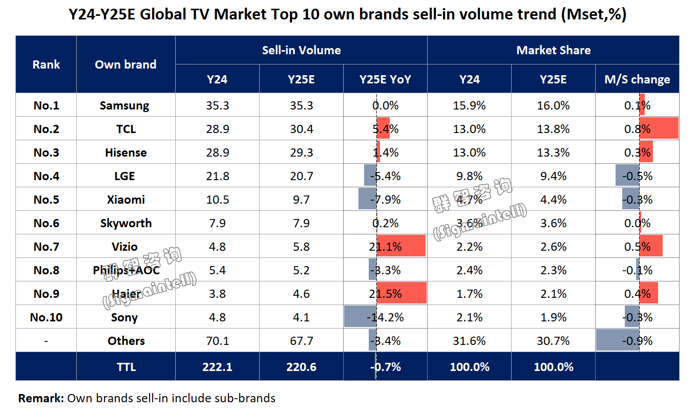 全球彩电“微跌”!2025,有个中国品牌或逆增21.5%,前十最高