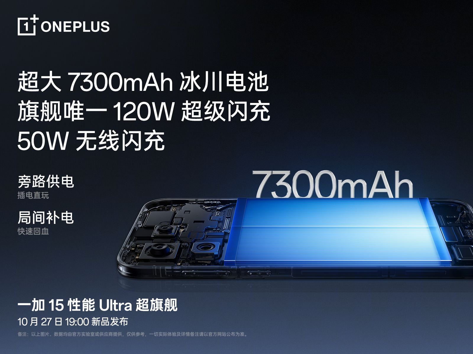 一加 15 搭载 7300mAh 超大「冰川电池」,带来 120W 有线闪充与 50W 无线闪充的豪华续航充电组合,并首发全新「局间补电」技术,在游戏间隙低电量时,充电 10 分钟,可多玩游戏 1.23 小时。同时,一加 15 还带来「旁路供电」技术,用户边玩边充时,电流直供系统,可显著减少发热与卡顿,为重度游戏爱好者提供持久的续航保障。
