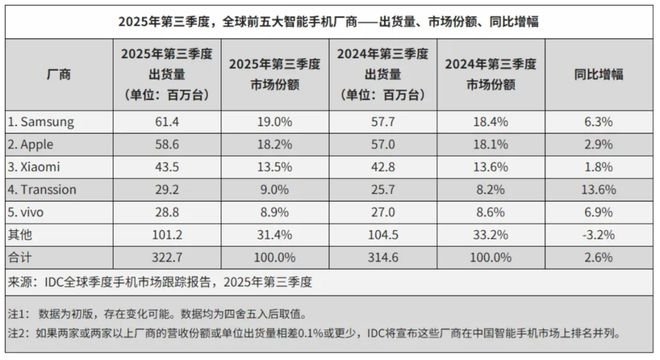 而在中国大陆市场,OPPO“掉队”的势头更加明显。Omdia数据显示,第三季度中国大陆市场vivo以1180万台的出货量位居第一,占据18%的市场份额;华为紧随其后,出货量为1050万台,市场份额为16%;苹果延续上涨趋势,出货量为1010万台,挤进前三;小米和OPPO则分别以1000万台和990万台的出货量位列第四和第五。