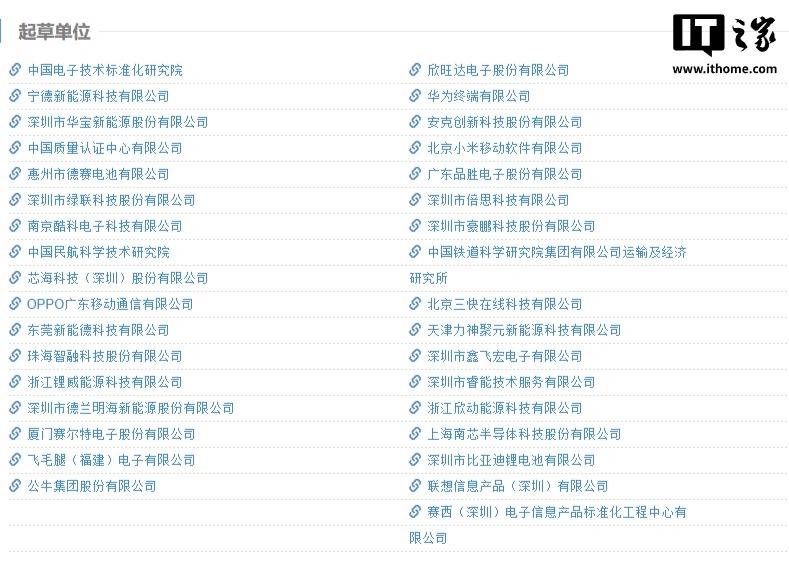 该标准由工业和信息化部归口,全国电子产品安全标准化技术委员会执行,中国电子技术标准化研究院联合欣旺达、宁德新能源、华为、小米、OPPO、安克、绿联等三十余家行业头部企业、科研院所及检测机构共同起草。